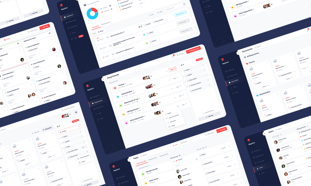 Regulatory change management template is a carefully designed web application for RegTech compliance and change management solutions. The RegTech Template is a well-structured Figma file with a set of pre-made screens and user flows, designed according to current UX / UI trends.